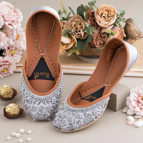 Gender: Women Category: Footwear Outfit Type: Khussa Color Type: Silver Sole Material: Leather Top Material: Silk Additional Description: Zun-113-silver roon...
