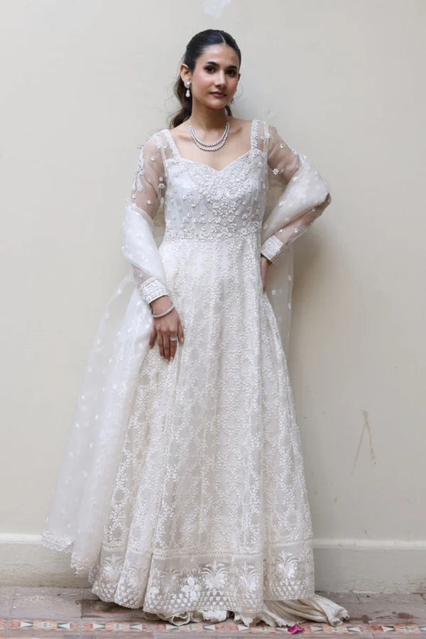 An elegant all-white organza kalidaar featuring a sweetheart neckline, paired with crushed dhaka pants and...