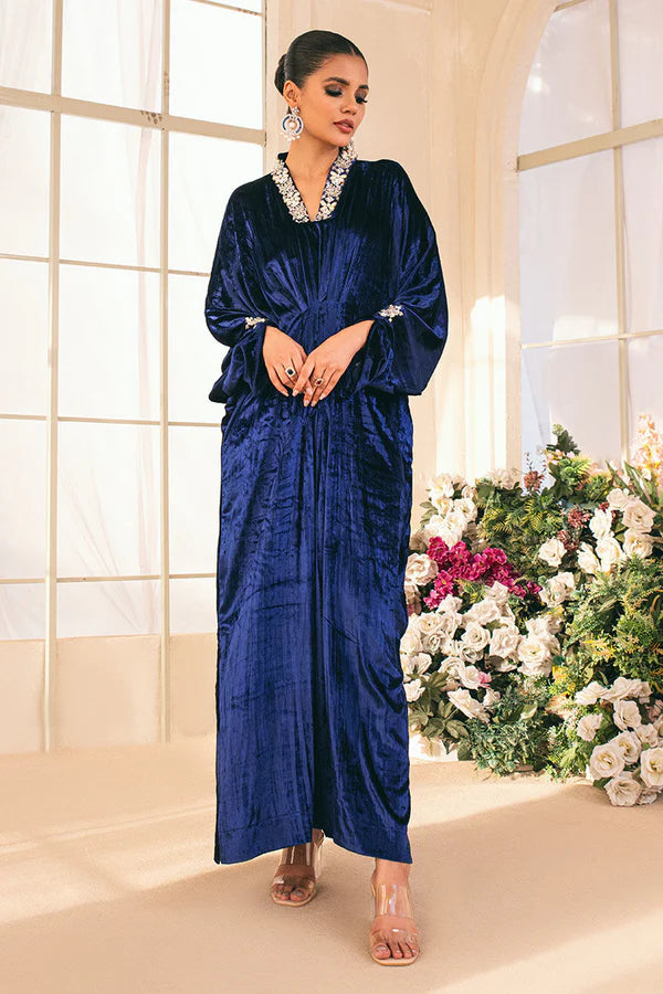 The sumptuous deep blue kaftan exudes glamour with its plush velvet fabric and intricate hand...
