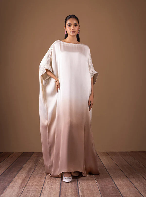 This shamose silk kaftan in gradient of an ivory and mud brown color truly gives...