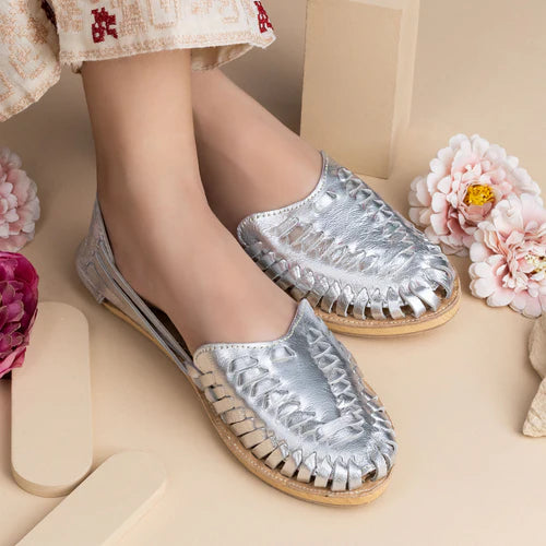 Gender: Women Category: Footwear Outfit Type: Khussa Color Type: Silver Sole Material: Leather Top Material: Silk Additional Description: Zun-113-silver roon...
