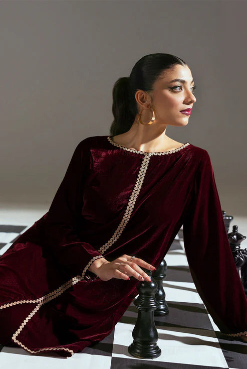 The royal maroon Set Includes a solid shirt and pants with a round boat neckline with front slit embossed with lace—pure premium velvet with a subtle sheen produced in-house!