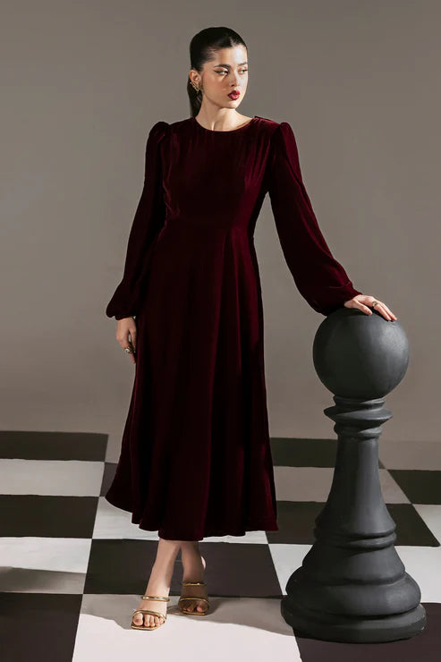 The maroon includes a Victorian round neckline along with puff sleeves premium velvet with a subtle sheen produced in-house!