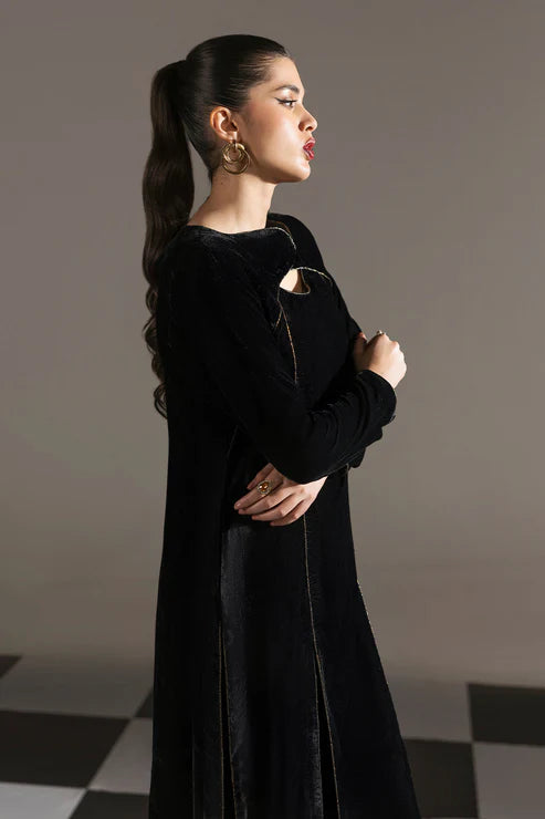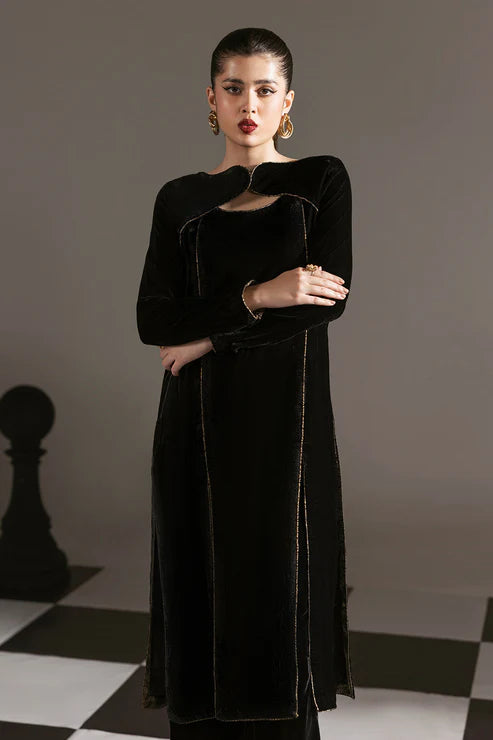 The Royal black Set Includes a solid shirt and pants with a wing neckline and two side open slits finished with banarasi fabric —pure premium velvet with a subtle sheen produced