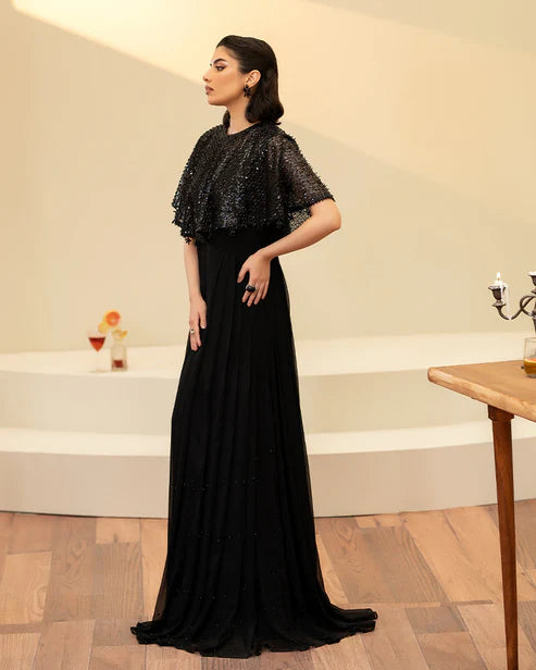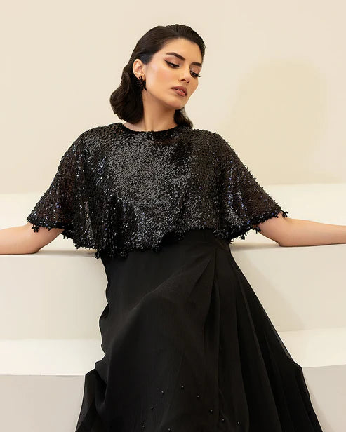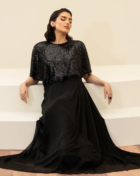 This elegant ensemble features a net sequin cutdana blero adorned with pearls.