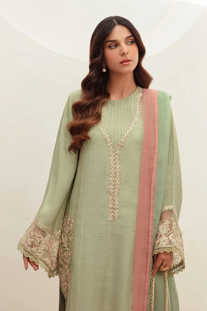 Unveil timeless beauty with this mint green Korean raw silk A-line shirt. Lavishly decorated with delicate resham embroidery in beige, peach, and mint threads, and accented with tilla and sequin embellishments, this outfit radiates elegance. Paired with a silk dupatta edged in peach and tailored straight cut pants, it's the ideal choice for an effortlessly chic and graceful appearance.