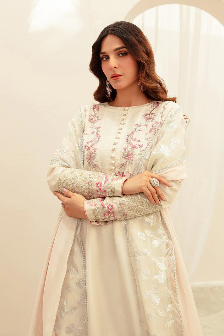 Enhance your elegance with our off-white creme Korean raw silk pishwas, paired with silk capris and a pink color-blocked chiffon dupatta. Finished with organza foil printed details, the pishwas features resham embroidery and sequin embellishments on the body and sleeves for a touch of timeless sophistication.