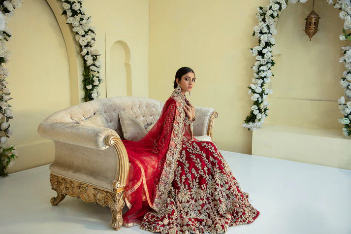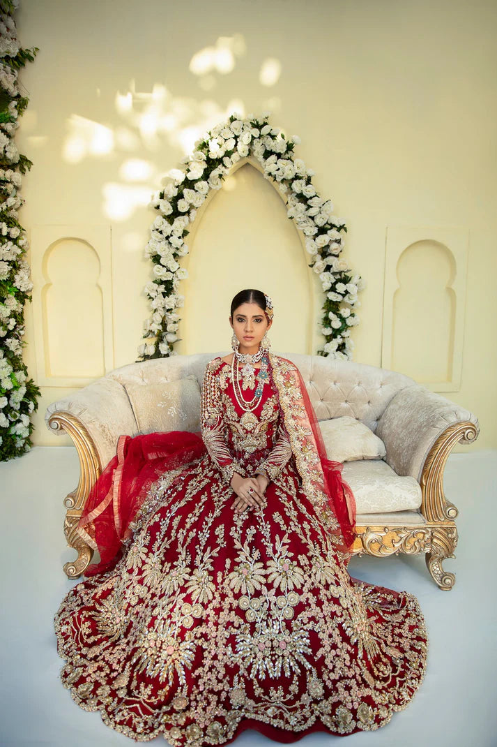 A deep red fabric with a heavily hand embellished front and back, featuring dabka, naqshi, resham and cutdana form this carefully curated ensemble.