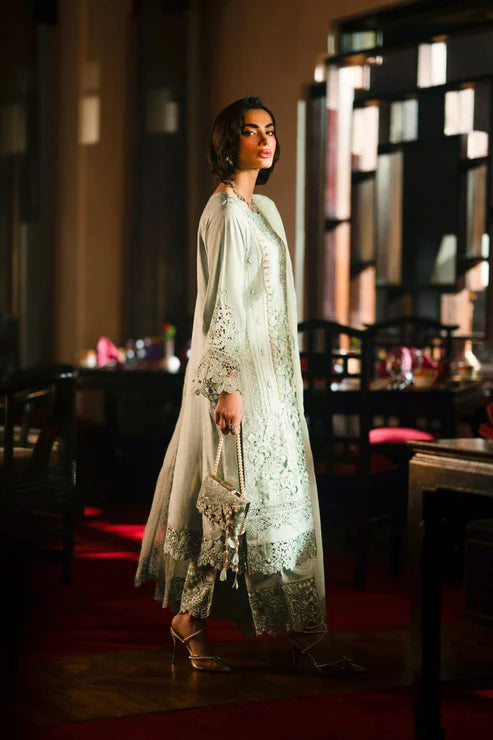 This exquisite pale ferozi ensemble showcases a long shirt adorned with intricate cutwork embroidery along the neckline, central panel, and side panels. The look is elevated by embellished plackets featuring pearls, crystals, and Swarovski accents. Paired with loose pants that have embroidered details, the outfit is beautifully completed with a cotton net dupatta, delicately finished with lace.