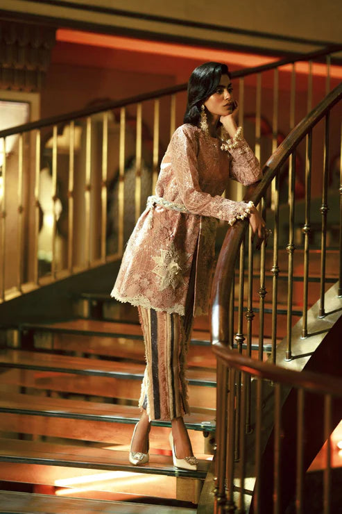 Presenting *Jude*: A signature masterpiece crafted from rich, embroidered organza, adorned with delicate sequin embellishments. 3D lace motifs in off-white add a striking contrast, while same-toned floral accents enhance its elegance. The sleeves feature chic cutwork borders and refined pearl edging. Paired with tailored pants, made from our custom-woven fabric infused with threads, sequins, and wool, this ensemble offers a perfect blend of texture and luxury.