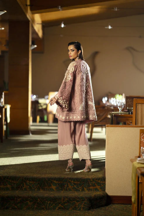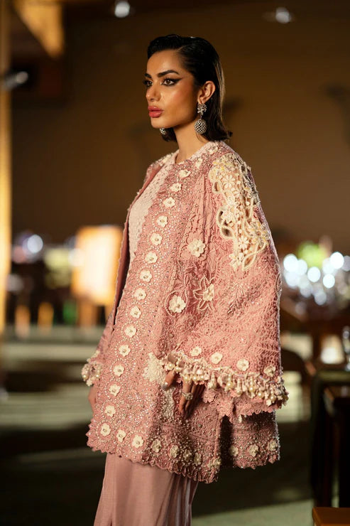 Introducing the 'Marlot' ensemble, a signature creation of sophistication and modernity. The lace inner shirt features intricate 3D lace embellishments on the border, adding texture and allure. The short jacket is a masterpiece, with lace insert cutwork patches, laser-cut organza appliqués, and a touch of cutdana and transparent white accents. 3D off-white flowers adorn the borders, bringing an elegant pop. Completing the look, the Korean silk shalwar pants offer a statement with refined off-white finishings. A perfect blend of craftsmanship and timeless design.