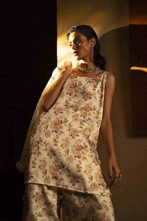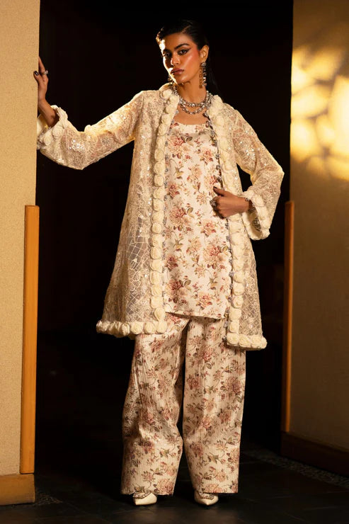 Introducing the Moonstone —a true masterpiece of elegance. This magical printed ensemble features a signature style with sequin-detailed pants, paired with an intricately embroidered jacket adorned with 3D flowers and Swarovski chains. Each piece reflects a luxurious finish, capturing the essence of timeless beauty and modern sophistication.