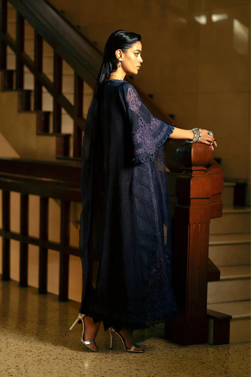 Introducing "Victoria" – an exquisite ensemble that exudes sophistication and elegance. This straight-cut outfit, crafted in a rich navy blue hue, features a beautifully pleated fabric, accentuated with intricate cutwork embroidery on the center and side panels. The neckline is luxuriously adorned with sparkling blue crystals, Swarovskis, and delicate cutdana, adding a touch of refined glamour.