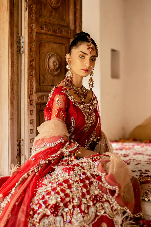 "MEHAK"; consists of a paneled lehnga exquisitely hand embroidered and embellished with dabka, gotta, 3d embellishments. petaled crystals and glass beads. It comes with an embellished short blouse that can be customized in longer length too. The outfit is further\npaired with a fully embellished dupatta with a four-sided border.