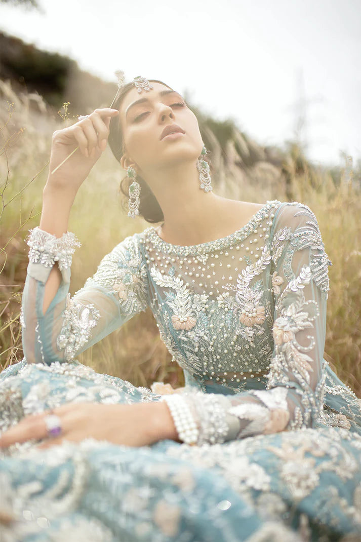 "M E H TAB"; this is a long gown exquisitely hand embroidered and embellished with dabka, gotta, 3d embellishments, petaled crystals, and glass beads. It comes with a paneled lehenga with an embellished border. The outfit is further paired with a fully embellished dupatta with a four-sided border.