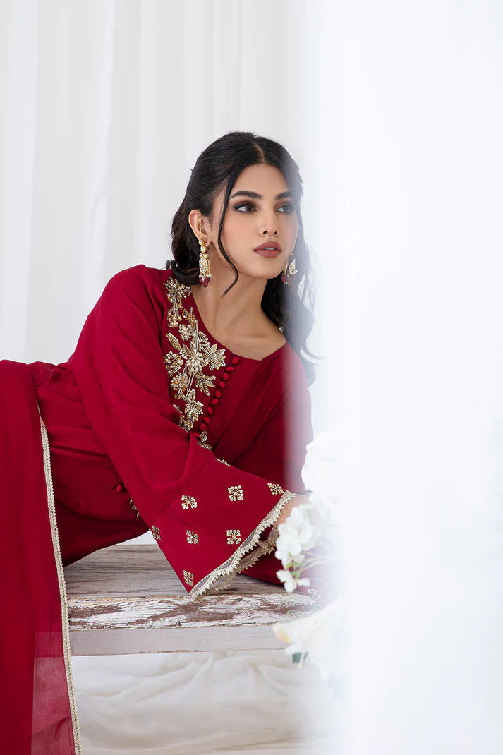 Engage yourself in the exquisite charm of the Celosia, A korean raw silk ensemble with delicate old-school embellishments along the neckline and sleeve. Completing the look with straight pants and a silk dupatta with customised tilla made finishings.