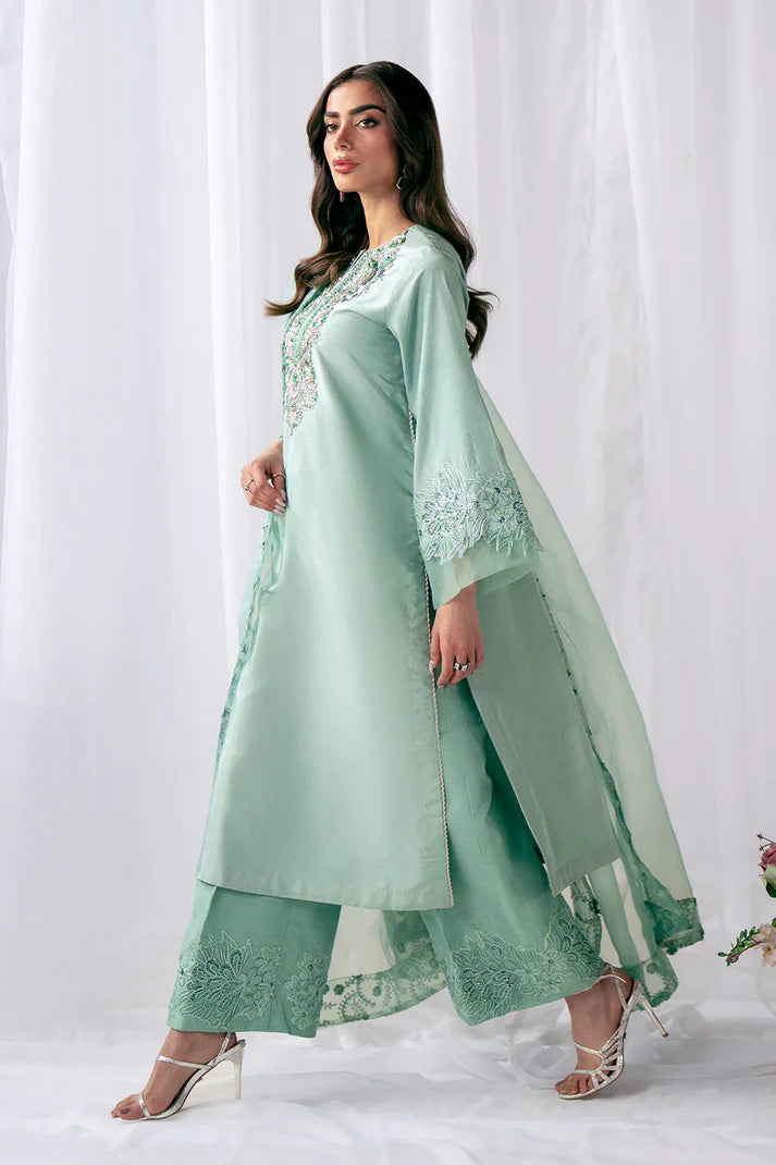 A sophisticated turquoise 3 piece outfit. Featuring a heavily embellished neckline with swarovskis, crystals, sequences and cutdana. The sleeves are finished with delicate embroidery of sequin and dori work, the same pattern goes on trousers border. The dupatta is a modern chic style on organza with signature sequin embroidered border.