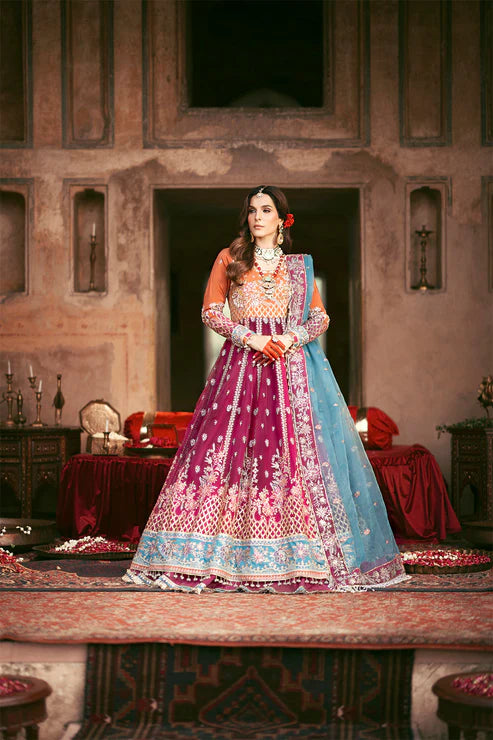 Adorned with hand-embellished Resham embroidery, the rawsilk blouse is a testament to meticulous artistry. Each sleeve tells a story, embellished with delicate motifs and bordered by intricate silk threads. The pièce de résistance? A breathtaking pishwas, fashioned from 12 masterfully embroidered panels, framed by twin borders that exude opulence. Paired with an organza dupatta, shimmering in Resham and sequin accents, and a flowing rawsilk lehnga, *Regalia* transforms luxury into a living, breathing work of art. Draped in Regalia, you don’t just wear elegance—you embody it.