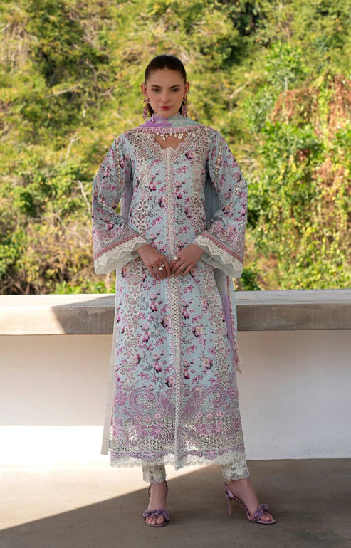 Color lovers, rejoice – it's Charlotte! ✨ Prepare to be impressed by the innovative design elements of this gorgeous outfit. The pretty ferozi and purple pink color mix is just the start! The organza embroidered insertions for the panels are designed to give a striking laser cutout feel – a truly modern and sophisticated touch. The neckline and daman border, crafted in two separate parts, are exquisitely detailed and unique. Embroidered sleeve borders add a polished finish. Completed with dyed pants and a beautifully printed silk dupatta, Charlotte is where cutting-edge design meets vibrant color, creating an unforgettable ensemble.