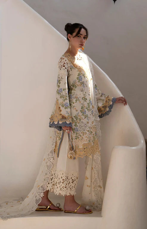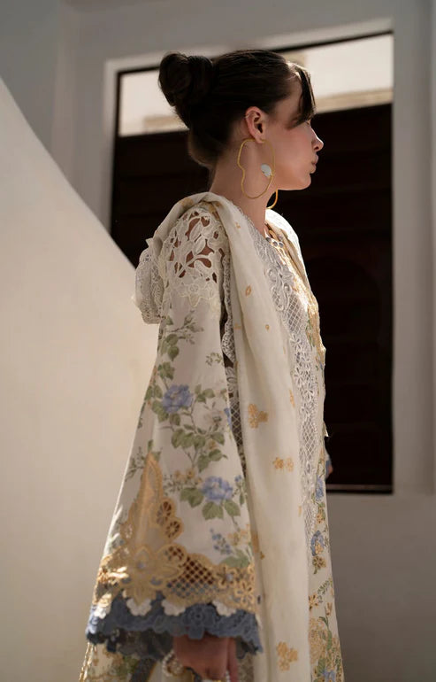 Step into a world of sunshine and delicate blooms – say hello to Maze☀️ The pretty beige floral base, awash in yellows, periwinkle, and sage, is instantly uplifting. But the magic truly begins with the yellow resham chikankari embroidery that dances across the front, enhancing the print with such delicate texture. And the daman? Oh, the daman! Composed motifs in an organza appliqué style are a true statement, beautifully framed by a thoughtfully designed lace border that graces both front and back. Even the sleeves whisper elegance with a single yellow resham thread border. Paired with dyed trousers and a Monark fabric dupatta embroidered with an all-over sprat petal design and a stunning 4-sided cutwork embroidered border – Sunbeam is pure artistry, designed to brighten your day.