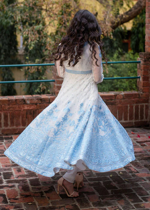 An ivory pishwas set intricately embroidered in maya blue, featuring delicate motifs that adorn the fabric, creating an elegant silhouette.. Paired with an embroidered white organza dupatta, showcasing geometric borders with intricate embroidery, crafted from lightweight organza fabric with a soft, flowing texture.