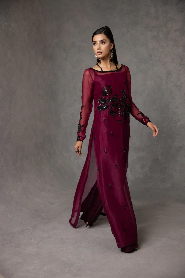 A PURE KATAN ORGANZA LONG SHIRT WITH HIGH SIDE SLITS FEATURING A HAND EMBELLISHED FRONT AND SLEEVES. COME WITH A PRINTED SLIP AND WIDE LEG TROUSERS.