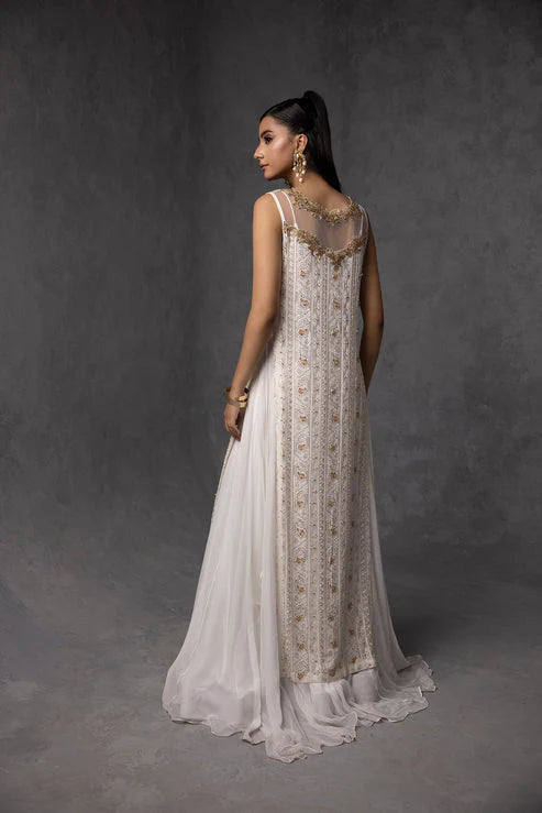 THIS 2 PIECE CHIKAN KARI EMBROIDERED GOWN FEATURES AN INTRICATELY HAND EMBELLISHED FRONT AND BACK NECKLINE WITH CRYSTAL WORK ON THE GOWN. THE LOWER GOWN IS PURE CHIFFON.