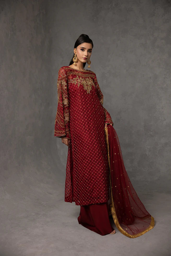 A PURE ORGANZA SHIRT WITH AN INTRICATELY THREAD EMBROIDERED BASE FEATURING HEAVY HAND EMBELLISHMENT ON THE NECKLINE AND SLEEVES IN DABKA, ARI, CRYSTALS AND CUT DANA. COMES WITH WIDE LEG PANTS AND A FULL LENGTH SLIP.