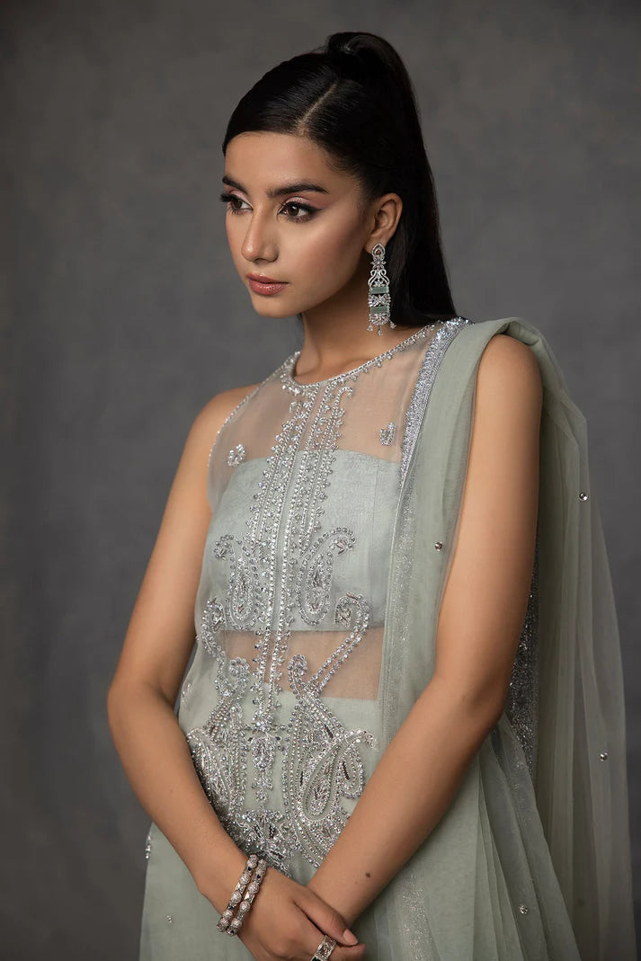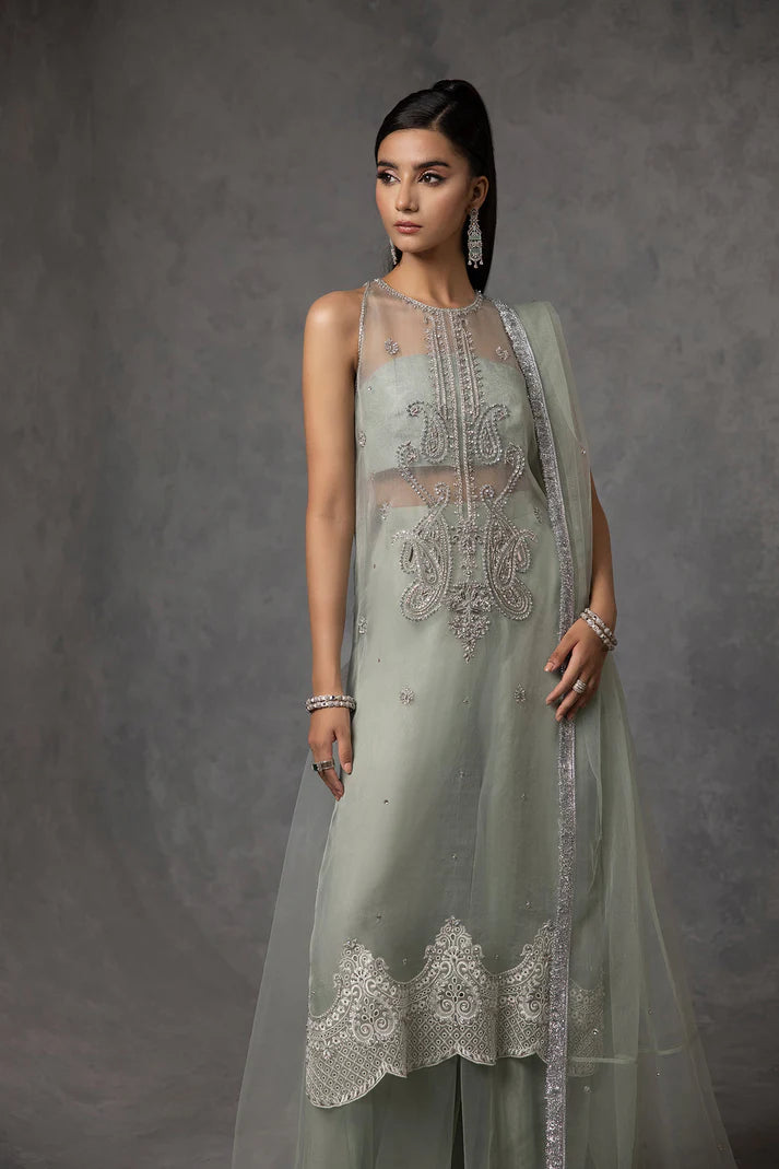 A PURE KATAN ORGANZA LONG SHIRT WITH AN EMBROIDERED BORDER AND HAND EMBELLISHED FRONT. THE BACK IS BLOCK PRINTED. COMES WITH A NET SHARARA AND DUPATTA WITH CRYSTAL CHAN AND KIRAN FINISHING.