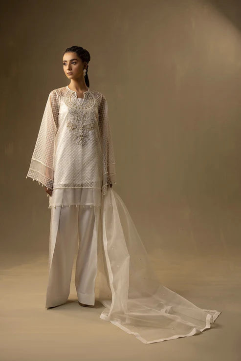 A short embrodiered organza kameez with a pearl worked nekline and front. Comes with wide sleeves with pearl detailing, a wide cuffed shalwar and slip.
