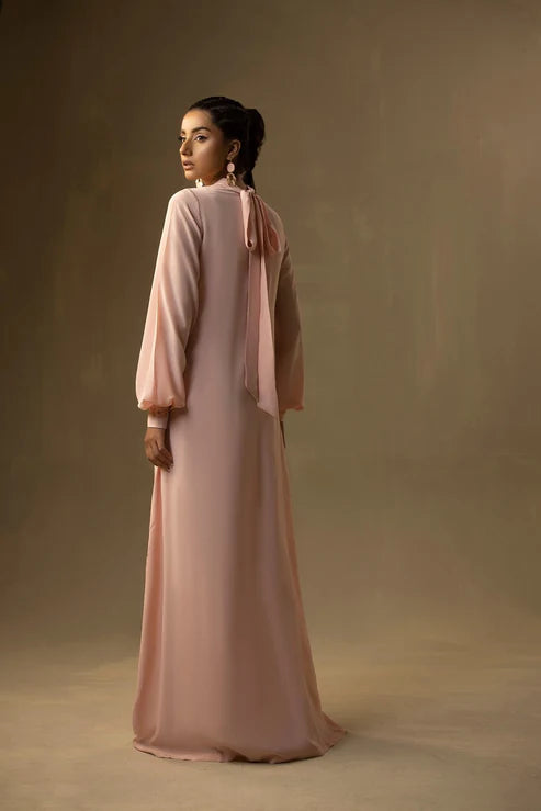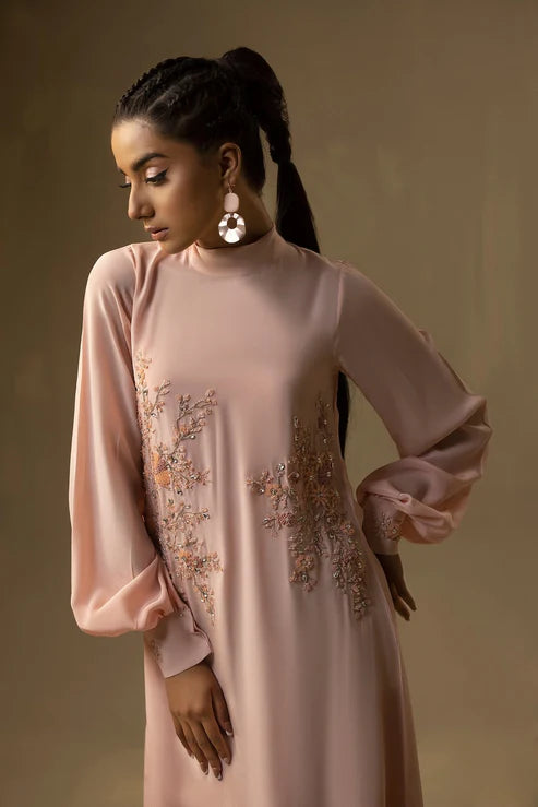 A Powder Pink pure crepe silk gown with hand embroidered cuffs and front. Comes with a pure cotton silk slip