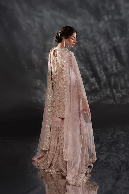 An ever so pretty, soft blush pink gharara set with ganga-jamni embellishment using sequins, crystals, and beads. An artistic floral and geometric layout is composed for this design covered in rich sequins and embroidery. A detailed neckline is beautified with sheer detailing for added effect. The dupatta comes with fully worked borders and handmade jewelled tassels further beautify this look.