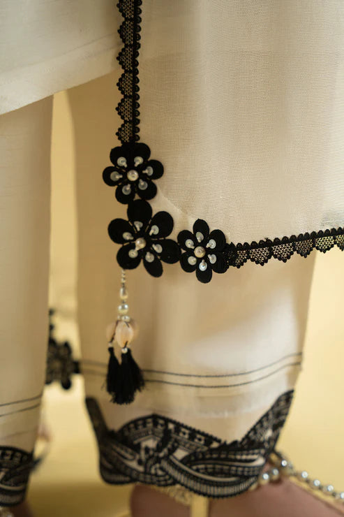 Off white base with a play of different black laces and fine black embroidery on the sleeves and pants hemline. Fine hand-embellishment using sequins and pearls and hand made tassles with dainty shell detailing are some of the features of this design. Modern elegance at its finest.