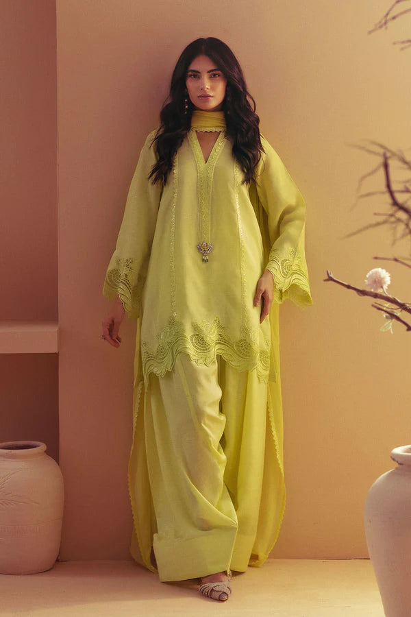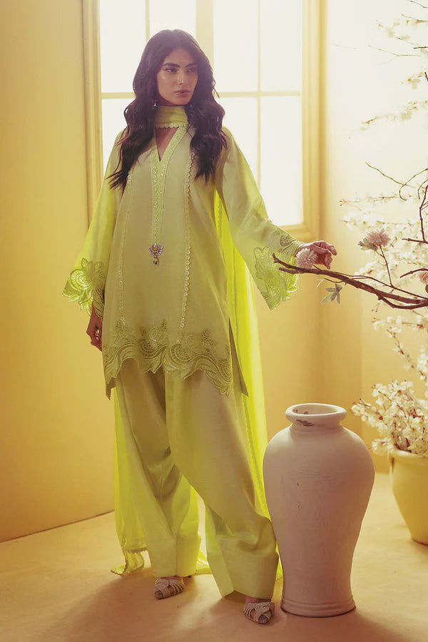 A short shirt in a vibrant tangy green, crafted from raw silk canvas, showcases an embossed organza appliqué border along the hemline. The neckline is elegantly adorned with handcrafted tassel details. This ensemble is complemented by a matching farshi shalwar and a coordinating chiffon dupatta, designed to create a striking statement look.