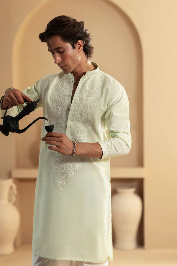 A knee-length kurta in an exquisite mint hue, adorned with intricate paisley and trellis motifs elegantly crafted in delicate white silk thread at the center front. This kurta is ideally complemented by loose-fitting pants, creating a distinguished and statement-making ensemble.