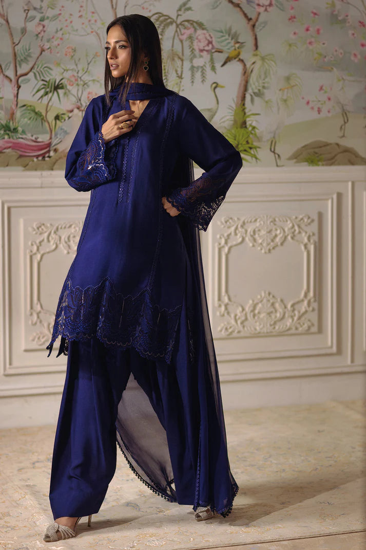 Knee-length shirt in a striking cobalt blue, adorned with embossed organza appliqué details. The neckline is enhanced with lace embellishments that catch the light, and the ensemble is complemented by farshi shalwar and a matching chiffon dupatta to complete the look.