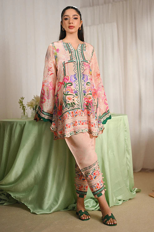 The Cherie outfit features a pretty pink and emerald green digital print on pure crepe. The short shirt is adorned with scalloped sleeves, complemented by a narrow printed Shalwar, offering a modern and elegant silhouette.