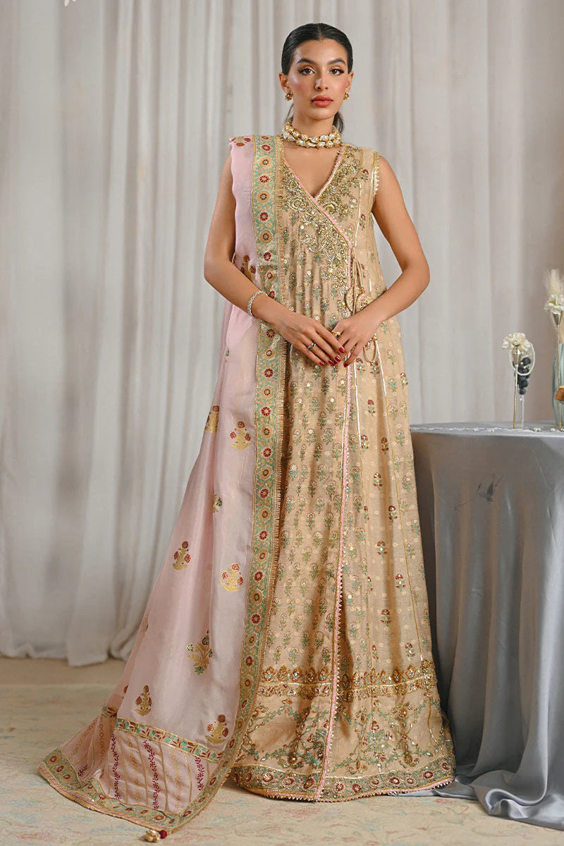 The Noelle ensemble is a stunning sleeveless beige Cotton net Kalidar, adorned with exquisite block printing and detailed handcrafted embellishments, including Gota, Dabka, and Tiki stones. Paired with a luxurious medium silk Cradle Pink dupatta and indian raw silk straight pants