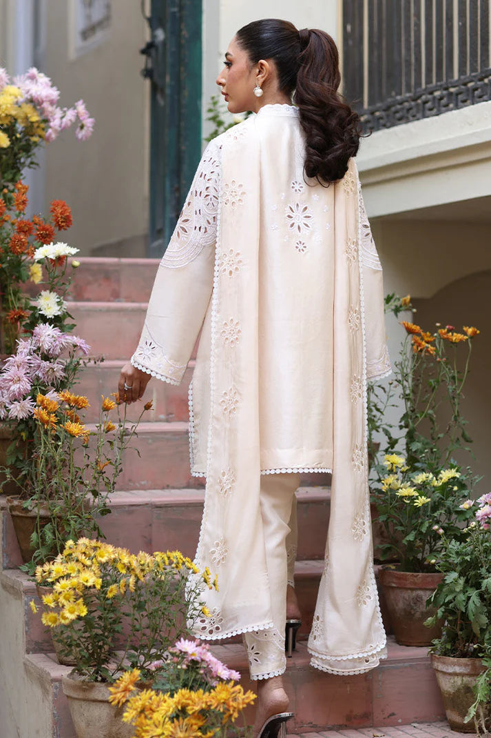 A refined expression of timeless elegance. This cream-hued short shirt, featuring delicate white embroidery and intricate cutwork, is paired with a slim-fit shalwar and a luxurious raw silk kameez. Complete with a beautifully crafted Shiffli silk dupatta.