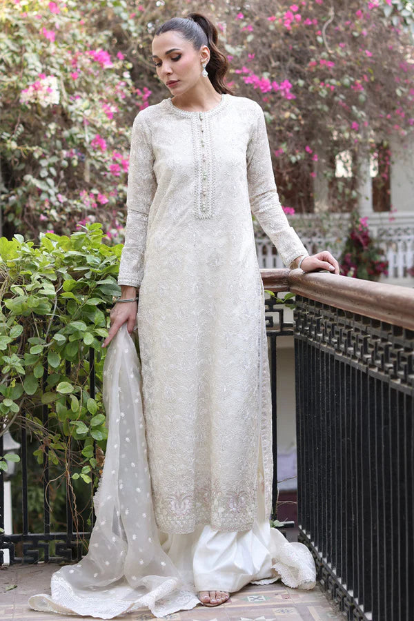 A breathtaking white embroidered khaddi net long kameez Paired with elegant white Dhaka pants and an exquisite organza dupatta, adorned with intricate border details.