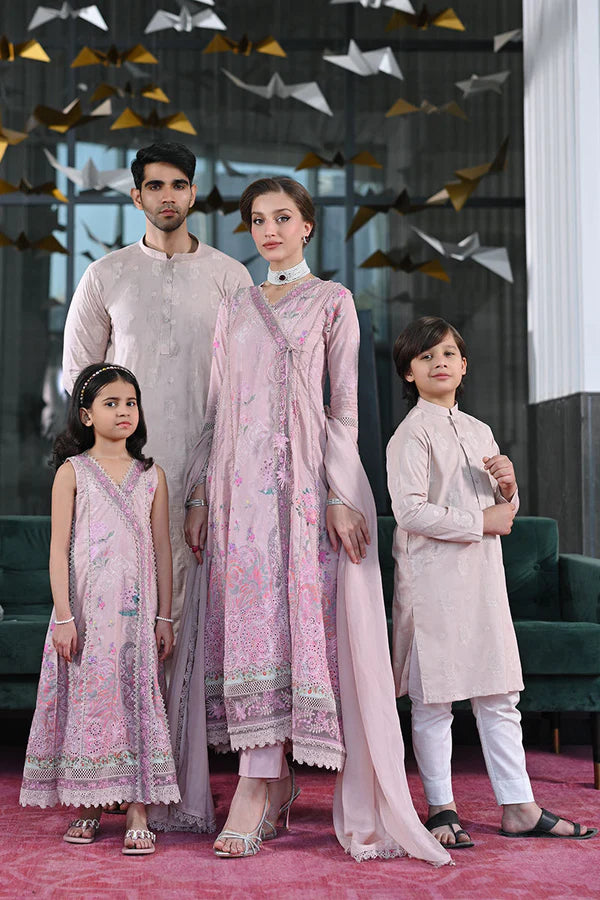 Our signature dusty pink Kalidar, exquisitely crafted with delicate lace detailing and ornate borders. Paired with a luxurious silk dupatta, adorned with lace borders, and complemented by perfectly tailored straight pants. A harmonious blend of elegance and timeless sophistication.
