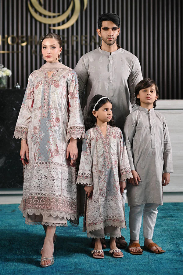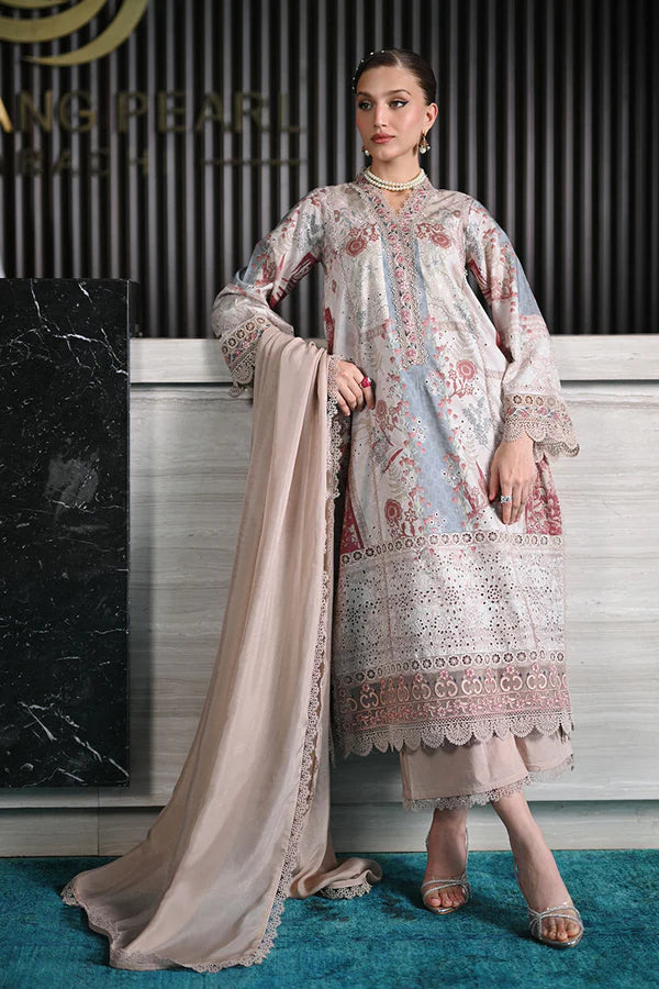 A stunning printed long shirt in a timeless beige and brown palette, elevated with embroidered organza lace borders and intricate lace detailing. The graceful bell sleeves add a touch of drama, while the ensemble is completed with a beautifully tailored izaar and a luxurious silk dupatta.
