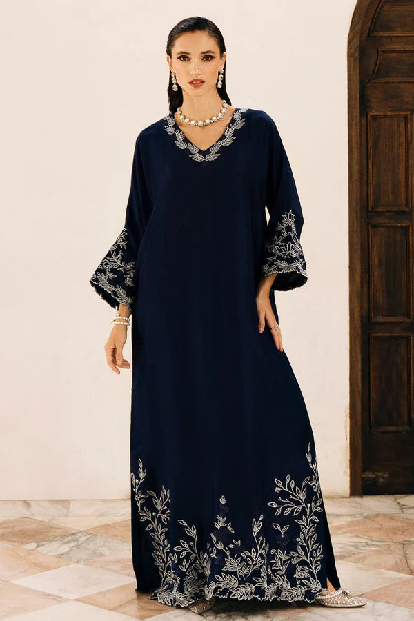 An enchanting dress for an enchanting evening. Stand out with this captivating navy blue kaftan. Crafted from luxurious raw silk, the kaftan features a mesmerizing display of white floral embroidery, accented with delicate cutwork details. This enchanting piece drapes beautifully, offering a silhouette that flatters and flows.