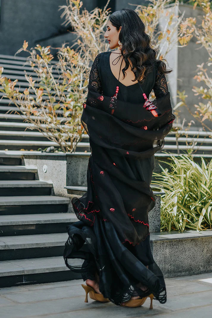 A pure raw-silk embroidered kalidar shirt with schiffli borders paired with straight pants and embroidered organza dupatta.