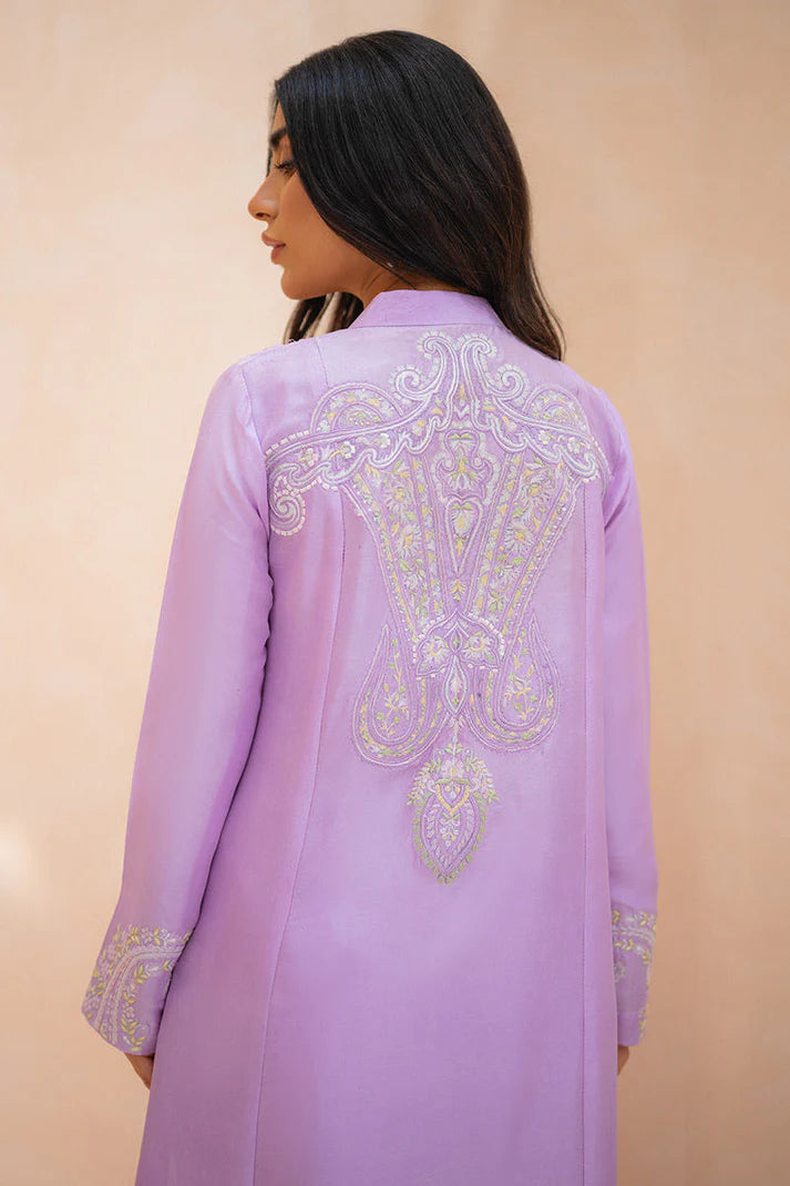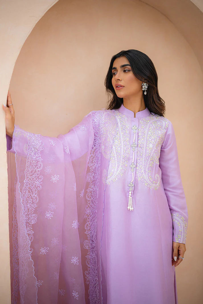 A lilac raw silk ensemble with intricate paisley motif detailing on the shirt, complemented by delicate button patti, transforms every glance into a moment of admiration. Paired with sleek straight pants and an ethereal organza dupatta.