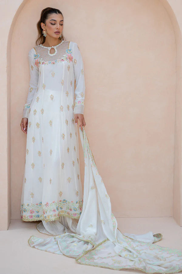 An ivory crepe silk open kalidar, embellished with delicate pastel tone embroidery becomes a canvas of sophistication. Organza detailing on the neckline adds a touch of whimsy. Handwork detailing enhances every thread of embroidery, a tribute to craftsmanship. The block-printed dupatta and crushed dhaka pants complete the symphony of luxury.