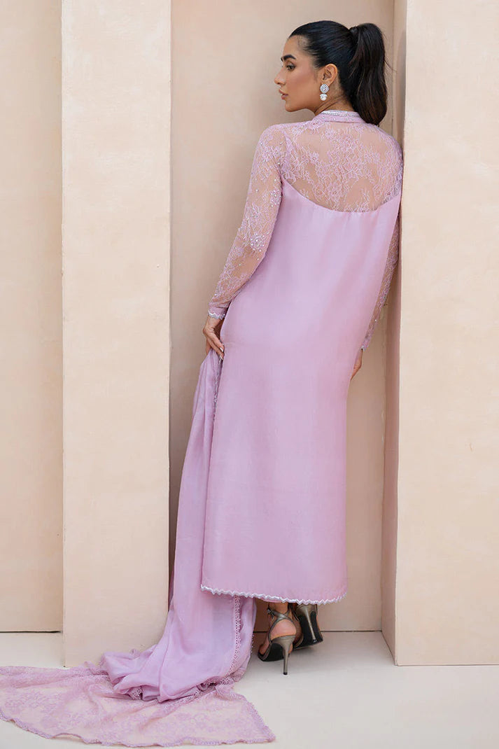Embrace the allure of the Rose Pink raw silk and chantilly lace ensemble. The chantilly lace details on the shirt are a testament to elegance, embellished by handwork featuring cutdana and sequins. Draped in a medium silk dupatta with lace borders, and accompanied by sleek straight pants.
