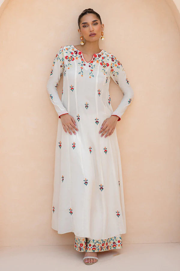 A white crepe silk charm, open kalidar whispers of timeless allure, adorned with resplendent jewel tone embroidery that graces the neckline and dances like stars across the fabric. Every step is a symphony of sophistication, accompanied by an izaar that adds a touch of grace. Wrapped in the medium silk embroidered dupatta, you wear a masterpiece of opulence.