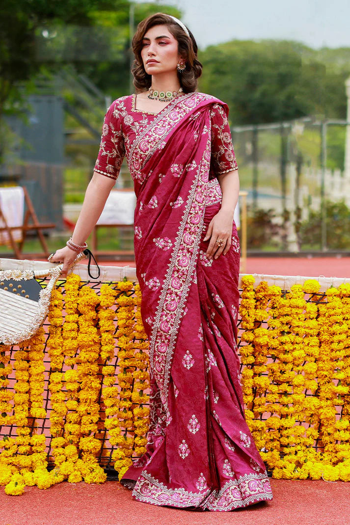 Draped in elegance, this magenta saree is crafted from soft medium silk and adorned with timeless block print detailing. It is paired with a raw silk blouse, hand-embellished to perfection and cut in a flattering sweetheart neckline with short sleeves. The luxurious textures and refined craftsmanship make this ensemble a statement of modern sophistication rooted in tradition. .