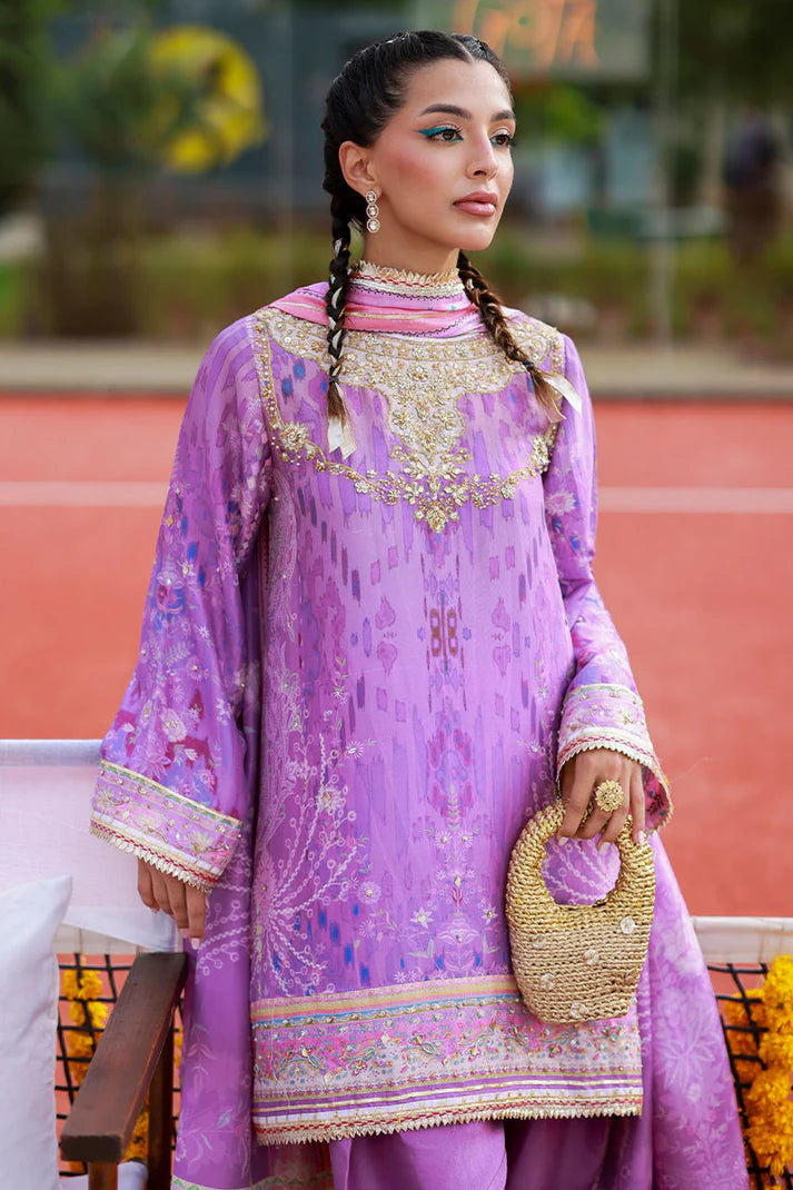 A vibrant purple digital printed short shirt, styled with an embellished boat neckline featuring delicate gotta, dabka, and sequins work. Paired with a classic raw silk narrow shalwar and a printed silk dupatta finished with elegant gotta details, this ensemble exudes festive charm and timeless sophistication..